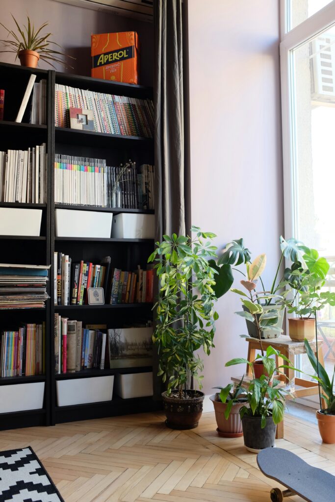 4 tiered shelves keep things organized: top shelf for your favorite novels, middle for travel souvenirs, bottom for storage boxes (holding kids’ puzzles or charging cables). No closed doors mean grabbing a book takes 2 seconds, and sunlight through the window turns the shelf—with its plants and colorful books—into a “living decoration.”