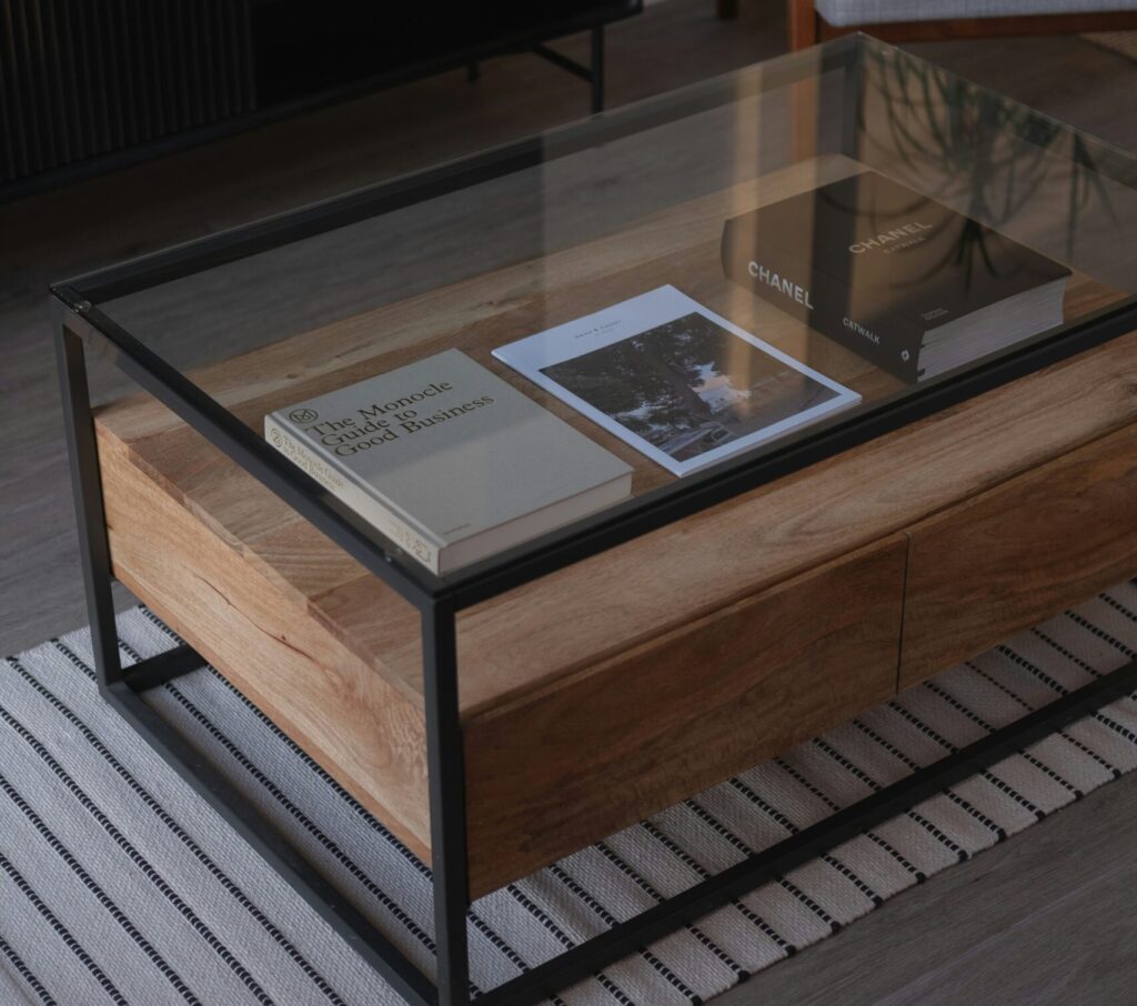 Functional center table for living spaces. Perfect for holding drinks, books, or decor, combining practicality with sleek design.